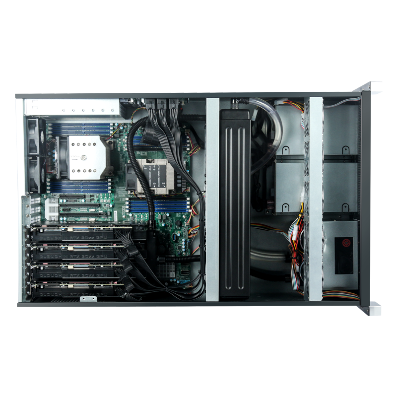 定制优化的液冷散热系统,支持 4 路 NVIDIA RTX 30系列或A800 GPU 全负荷运行